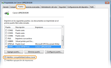 En la pestaña [Puertos], compruebe que está marcada la casilla de verificación [Habilitar compatibilidad bidireccional].