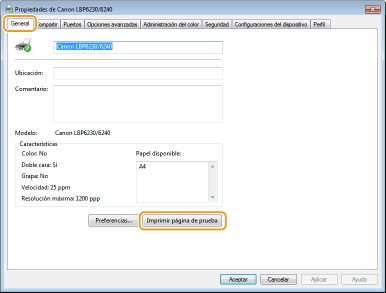 En la pestaña [General], haga clic en [Imprimir página de prueba].