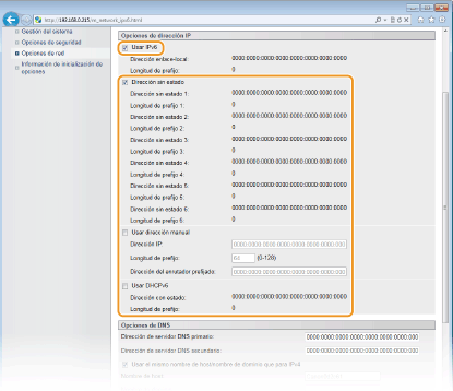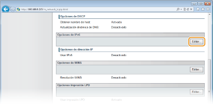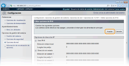 Para configurar direcciones IPv6 utilice el IU remoto. Antes de configurar direcciones IPv6, compruebe que la dirección IPv4 se ha configurado correctamente (Visualización de las opciones de red). Puede registrar hasta nueve de las siguientes direcciones IPv6.