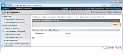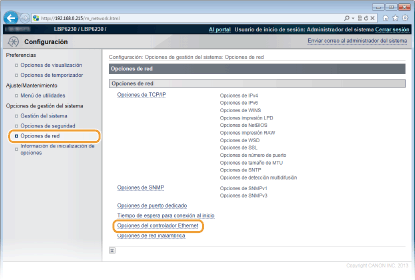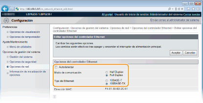 Ethernet es un estándar de comunicación de datos en una LAN. Usted puede configurar el modo de comunicación (Half Duplex/Full Duplex) y el tipo de Ethernet (10BASE-T/100BASE-TX). La configuración predeterminada de fábrica, el modo de comunicación y el tipo de Ethernet son detectados automáticamente. Por lo general, las opciones de Ethernet pueden utilizarse tal cual vienen configuradas, pero utilice el procedimiento siguiente para especificar las opciones de forma manual según sea necesario.