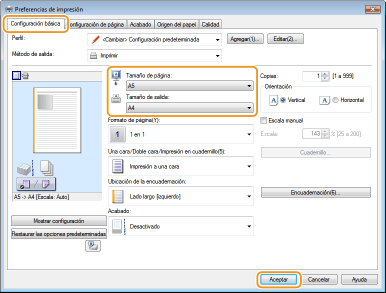 Seleccione el tamaño del papel en [Tamaño de salida]