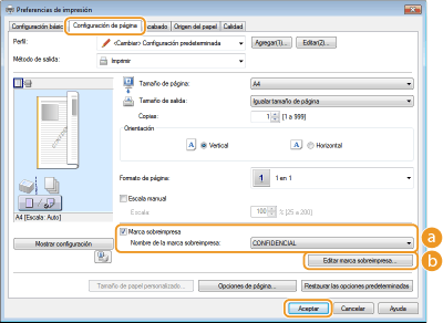 Puede imprimir marcas sobreimpresas tales como "COPIA" o "CONFIDENCIAL" sobre el contenido del documento. Puede crear nuevas marcas sobreimpresas o utilizar marcas sobreimpresas registradas previamente.