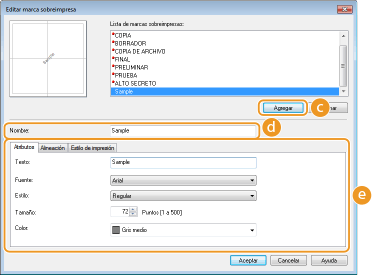 Haga clic en cada pestaña para especificar el texto, el color o la posición de impresión del nombre de la marca sobreimpresa. Para obtener más información sobre la configuración, haga clic en [Ayuda] en la pantalla del controlador de impresora.