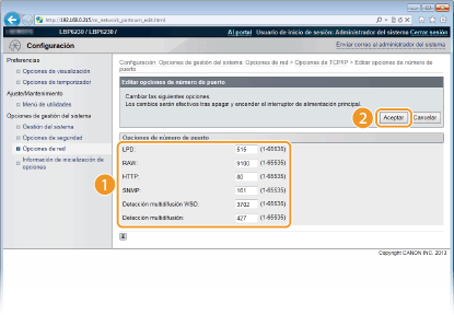 Los puertos sirven como extremos para establecer la comunicación con otros dispositivos. Normalmente, los números de puerto estándar se utilizan para los principales protocolos, pero los dispositivos que utilizan estos números de puerto son vulnerables a ataques debido a que estos números de puerto son muy conocidos. Para reforzar la seguridad, algunos administradores de red prefieren cambiar los números de puerto. Cuando se modifica un número de puerto, el nuevo número debe compartirse entre los dispositivos de comunicación, como es el caso de los ordenadores y los servidores. Si cambia un número de puerto, configúrelo también en este equipo.