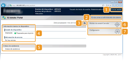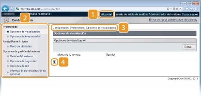 Muestra la página [Configuración]. Si inicia una sesión en modo de administrador de sistema, puede utilizar esta página para cambiar la configuración del equipo.