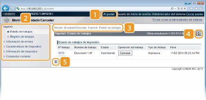 Muestra la página [Monitor de estado/Cancelar]. Puede utilizar esta página para consultar el estado de impresión actual, para cancelar el proceso de impresión y para ver un historial de los trabajos de impresión.