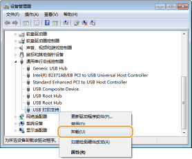 右键单击 [USB 打印支持],然后单击 [卸载]。