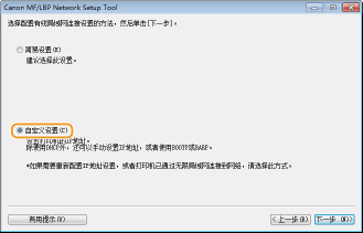 连接方法从无线局域网切换到有线局域网时需要卸载当前安装的打印机驱动程序,配置有线局域网连接,然后重新安装打印机驱动程序。配置有线局域网连接时,配置方法选择 [自定义设置]。