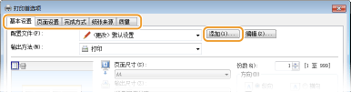 可根据需要在 [基本设置]、[页面设置]、[完成方式]、[纸张来源] 和 [质量] 选项卡上进行打印设置。