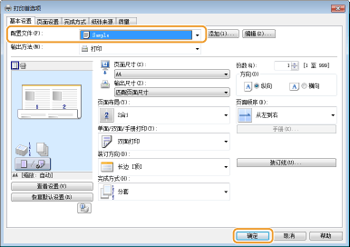 每次打印时指定“在 A4 尺寸纸张上单面横向墨粉节省模式”等设置组合会比较耗时。如果将常用的打印设置组合注册为“配置文件”,则只需从列表中选择配置文件即可指定打印设置。本节旨在说明如何注册配置文件以及如何使用配置文件进行打印。