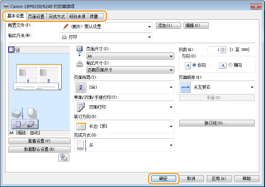 可根据需要在 [基本设置]、[页面设置]、[完成方式]、[纸张来源] 和 [质量] 选项卡上进行打印设置。