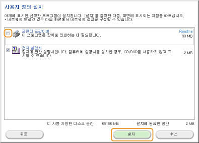 [프린터 드라이버] 확인란의 선택을 해제하고 [설치]를 클릭합니다.