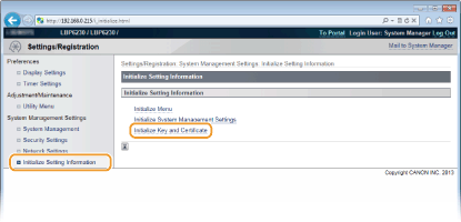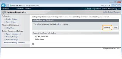 키 쌍(키 및 인증서 설정) 및 CA 인증서의 설정을 출고 시 기본 설정으로 복원할 수 있습니다. 기기에 등록된 모든 키 쌍과 CA 인증서(사전 설치된 CA 인증서 제외)는 초기화로 인해 삭제된다는 점을 유념하십시오.
