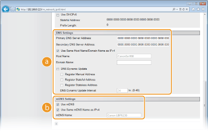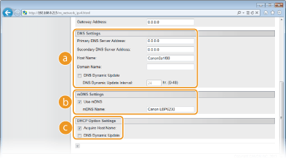 기기의 IP 주소와 호스트 이름 간의 연결이 변경될 때마다(예: DHCP 환경에서) DNS 레코드를 자동으로 업데이트하려면 확인란을 선택합니다. 업데이트 간격을 지정하려면 [DNS Dynamic Update Interval] 텍스트 상자에 시 단위로 시간을 입력합니다. 동적 업데이트를 사용하지 않으려면 확인란의 선택을 해제합니다 [mDNS Settings][Use mDNS]