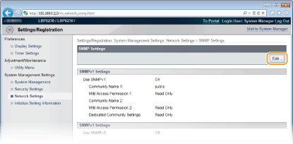 SNMP(Simple Network Management Protocol)는 MIB(Management Information Base) 데이터베이스를 사용하여 네트워크의 통신 장치를 모니터링하고 제어하기 위한 프로토콜입니다. 본 기기는 SNMPv1 및 보안 기능이 개선된 SNMPv3을 지원합니다. 문서를 인쇄하거나 Remote UI를 사용할 때 컴퓨터에서 기기의 상태를 확인할 수 있습니다. SNMPv1 또는 SNMPv3를 각각 또는 동시에 모두 활성화할 수 있습니다. 네트워크 환경과 사용 목적에 맞게 각 버전의 설정을 지정합니다.