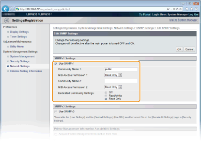 두 가지 버전의 SNMP가 모두 활성화된 경우 SNMPv1에서 MIB 액세스 권한을 [Read Only]으로 설정하는 것이 좋습니다. SNMPv1 및 SNMPv3에서(SNMPv3의 각 사용자에 대해) 개별적으로 MIB 액세스 권한을 설정할 수 있습니다. SNMPv1에서 [Read/Write](모든 액세스 권한)를 선택하면 SNMPv1로 대부분의 기기 설정을 제어할 수 있기 때문에 SNMPv3에 특화된 견고한 보안 기능이 효력을 잃게 됩니다.