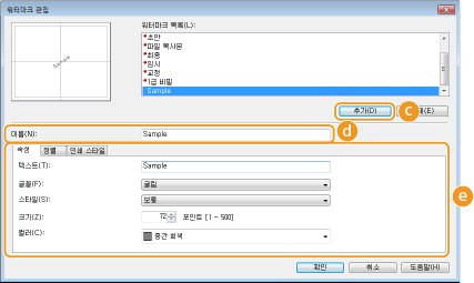 각 탭을 클릭하여 워터마크 이름의 텍스트, 색상 또는 인쇄 위치를 지정합니다. 설정에 대한 자세한 내용을 보려면 프린터 드라이버 화면에서 [도움말]을 클릭하십시오.