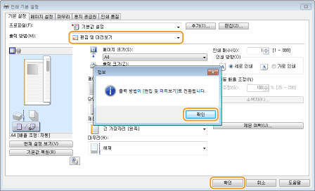 [출력 방법]에서 [편집 및 미리보기]를 선택합니다.