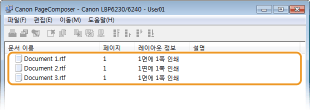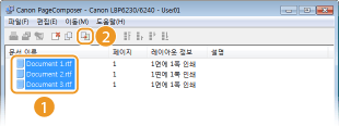 Canon PageComposer를 사용하여 여러 문서를 한 개의 인쇄 작업으로 결합하고 지정된 인쇄 설정으로 인쇄할 수 있습니다. 이 기능을 사용하면 예를 들어, 다른 응용 프로그램으로 작성한 문서를 합치고 모든 페이지를 동일한 크기로 인쇄할 수 있습니다.
