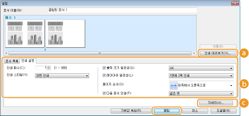 프린터 드라이버의 인쇄 설정 화면을 표시합니다. 정식 인쇄 방법을 사용할 때보다 사용 가능한 설정이 적습니다.