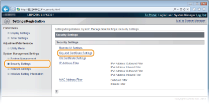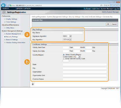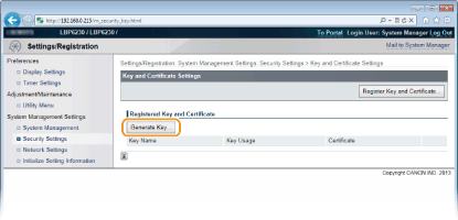 SSL(Secure Sockets Layer)을 통한 암호화된 통신에 필요한 키 쌍을 기기에서 생성할 수 있습니다. Remote UI를 통해 기기에 액세스할 때 SSL을 사용할 수 있습니다. 최대 3개의 키 쌍을 기기에 등록할 수 있습니다.