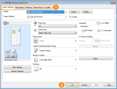Click the [Basic Settings], [Page Setup], [Finishing], [Paper Source], or [Quality] tab to specify the print settings on each screen as necessary.