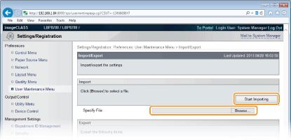 You can save the setting data of the menu options in your computer, or register the saved data in the machine. The exported data can be imported. If the machine model is the same, other machines can import the data exported from this machine and vice versa. These operations can be performed only when you have logged on in Management Mode.