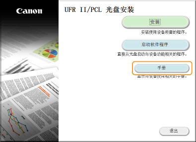 用户软件光盘(UFR II/PCL)包含 UFR II 和 PCL 打印机驱动程序,用户软件光盘(PS)包含 PS 打印机驱动程序。请选择适合您操作环境和需求的打印机驱动程序。通常,推荐 UFR II 打印机驱动程序。