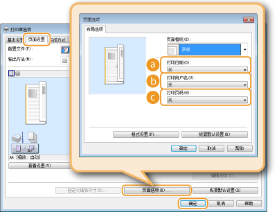 打印日期、登录名或页码时,可更改字体和字号等格式详细信息。在上面所示的 [页面选项] 屏幕上单击 [格式设置] 可指定详细信息。