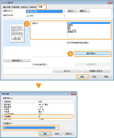 在 [高级设置] 屏幕中,还可指定 [节省墨粉] 设置以外的多种打印设置。有关更多信息,请单击打印机驱动程序屏幕上的 [帮助]。