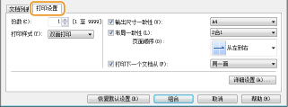 ![]() 单击 [打印设置] 选项卡,可显示指定打印设置(如份数或单面/双面打印)的屏幕。此处指定的设置应用于全部打印作业。