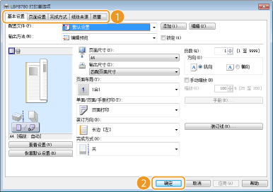 单击 [基本设置]、[页面设置]、[完成方式]、[纸张来源] 或 [质量] 选项卡,根据需要在各屏幕上指定打印设置。