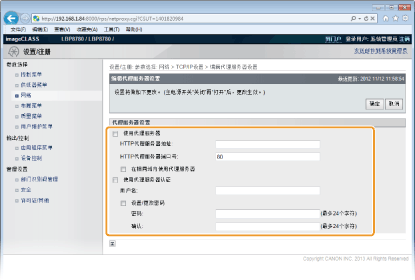 要设置使用代理服务器认证的密码,请选中复选框并在 [密码] 文本框中最多输入 24 个字符的密码。为了确认,在 [确认] 文本框中输入相同的密码。
