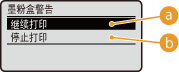 墨粉盒快到更换时间时,显示 <墨粉盒不久将达到使用寿命。> 信息,并且打印暂时停止。要恢复打印,请按下