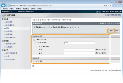 选中该复选框可设置 FTP 打印密码,并在 [密码] 文本框中最多输入 24 个字母数字字符的密码。为了确认,在 [确认] 文本框中输入相同的密码。