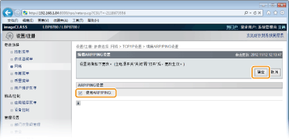 如果清除复选框,则无法使用 ARP/PING 功能更改 IP 地址。选中复选框则启用 ARP/PING 功能。也可从操作面板指定是否使用 ARP/PING 功能(