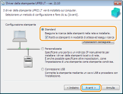 Selezionare [Standard], selezionare la casella di controllo [Riattiva stampanti in modalità di attesa ed esegui ricerca] e fare clic su [Avanti].