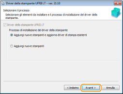 Se è già installato un driver della stampante, la schermata [Selezionare il processo] viene visualizzata prima della schermata [Selezionare le stampanti da installare]. Per la stampante, la selezione qui eseguita non influisce sul processo di installazione. Fare semplicemente clic su [Avanti]. ![]() Se la scheda [Periferiche IPv6] non è visualizzata