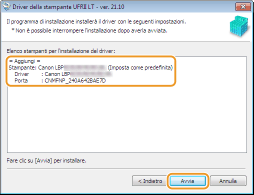 Controllare le informazioni della stampante in [Elenco stampanti per l'installazione del driver] e fare clic su [Avvia].