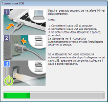 Quando viene visualizzata la schermata seguente, collegare il computer e la stampante con un cavo USB (Connessione tramite USB) e accendere la stampante.