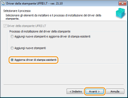 Selezionare [Aggiorna driver di stampa esistenti] e fare clic su [Avanti].