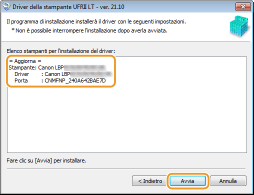 Controllare le informazioni della stampante [Elenco stampanti per l'installazione del driver] e fare clic su [Avvia].