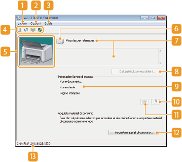 La finestra di stato della stampante consente di verificare lo stato della macchina, visualizzare errori e configurare impostazioni relative alla macchina, ad esempio il risparmio energetico. Consente inoltre di eseguire operazioni quali la cancellazione di un lavoro di stampa o la stampa di un elenco di impostazioni della macchina. La finestra stato stampante viene installata automaticamente sul computer all'installazione del driver della stampante (