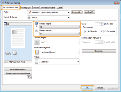 Scheda [Impostazioni di base] Selezionare il formato del documento in [Formato pagina] Selezionare il formato del foglio in [Formato stampa] [OK]