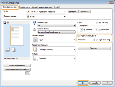 Scheda [Impostazioni di base] Selezionare la casella di controllo [Proporzioni manuali] Specificare il rapporto di stampa in [Proporzioni] [OK]