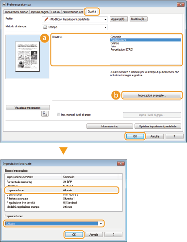 Scheda [Qualità] Selezionare il tipo di documento in [Obiettivo] Fare clic su [Impostazioni avanzate] Selezionare [Risparmio toner] nella schermata [Impostazioni avanzate] Selezionare [Attivato] dall'elenco a discesa [OK] [OK]