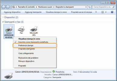 Fare clic con il pulsante destro del mouse sull'icona della macchina, quindi fare clic su [Preferenze stampa].