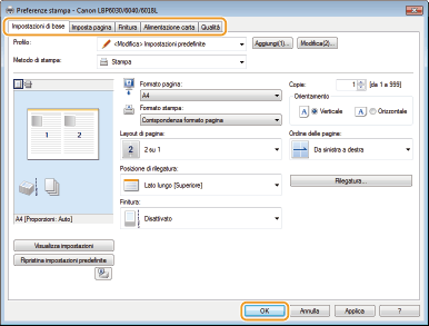 Eseguire le impostazioni di stampa come richiesto sulle schede [Impostazioni di base], [Imposta pagina], [Finitura], [Alimentazione carta] e [Qualità].