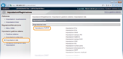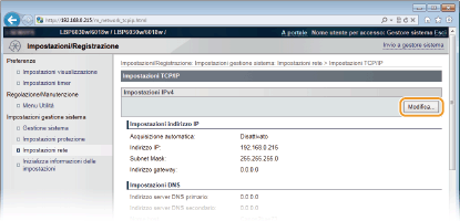 ![]() Per non usare DHCP/BOOTP/RARP per l'assegnazione automatica di un indirizzo IP Selezionare [Disattivato]. Se si seleziona il protocollo [DHCP], [BOOTP] o [RARP] quando questi servizi non sono disponibili, la macchina sprecherà tempo e risorse di comunicazione nella ricerca di questi servizi nella rete.