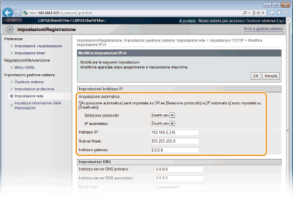 Impostare i campi [Indirizzo IP], [Subnet Mask] e [Indirizzo gateway].